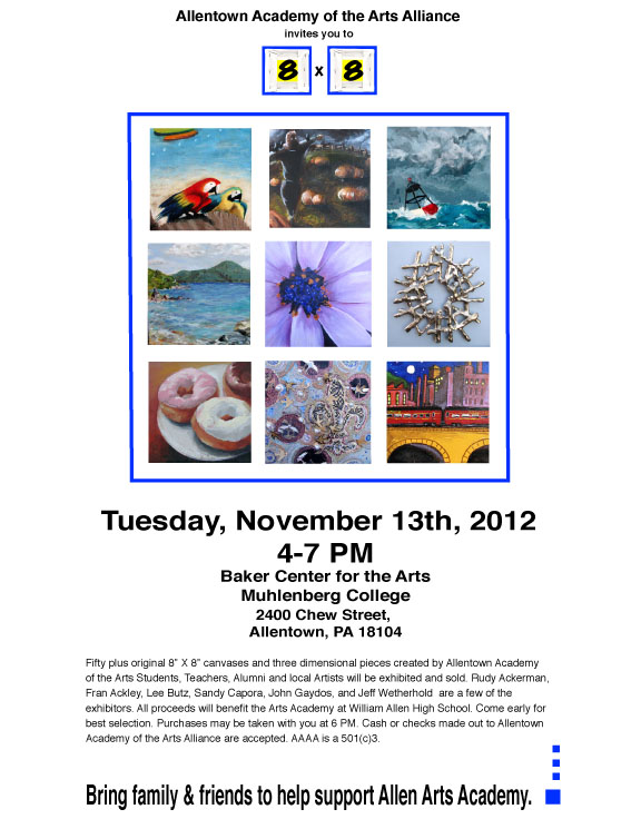 For the show, local artists as well as former students are asked to donate an 8″ x 8″ work of art which will (hopefully) be sold at the end of the evening, with all proceeds to benefit the Academy.