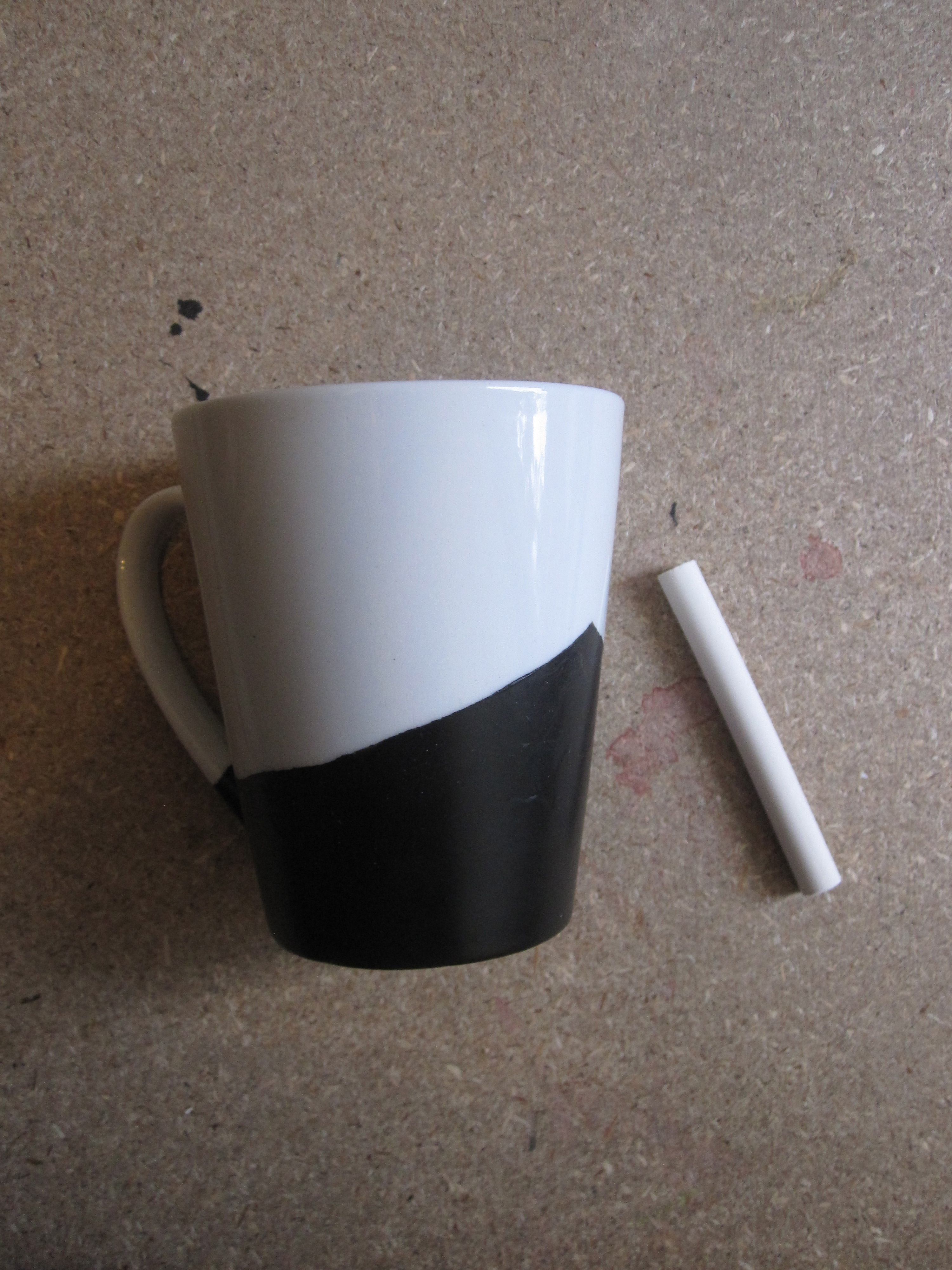 All you need to do is apply the paint where you’d like the person to be able to write on the mug (top tip- no where near where their mouth will be, don’t kill em), tape the areas you don’t want painted, let dry for 24 hours, peel tape off, and then bake the mug at 150 Celsius for 35 minutes. Careful not to brush the paint on too thickly, as you will notice where the paint runs slightly once it dries (although it is very thick paint!) Also, don’t let the mug dry with the directionality of the paint heading towards the masking tape or bits of the paint will seep under the tape, making it quite difficult to get a straight even line.