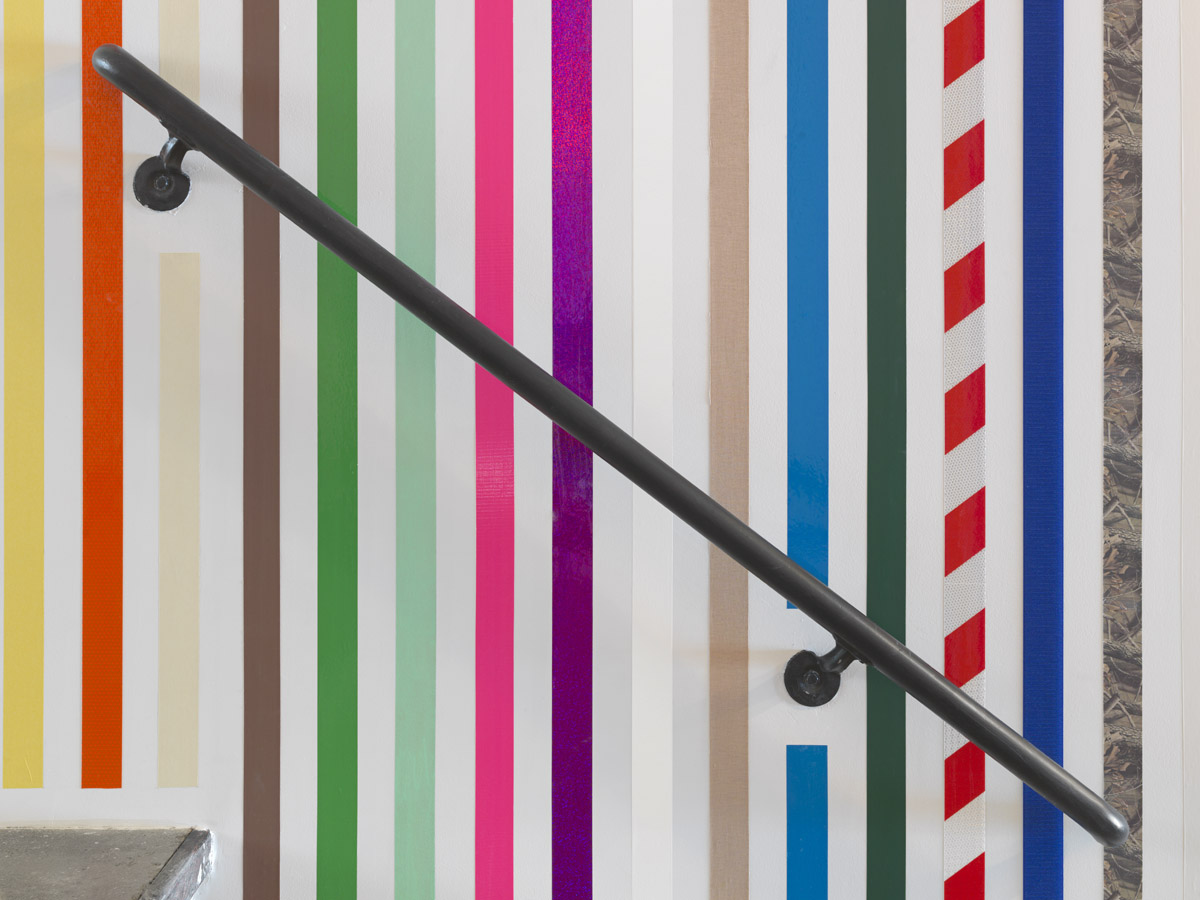 The work consists of strips of different types of 2 inch wide adhesive tapes. The dimensions are variable according to where it is located. This work is now permanent at Hauser & Wirth.