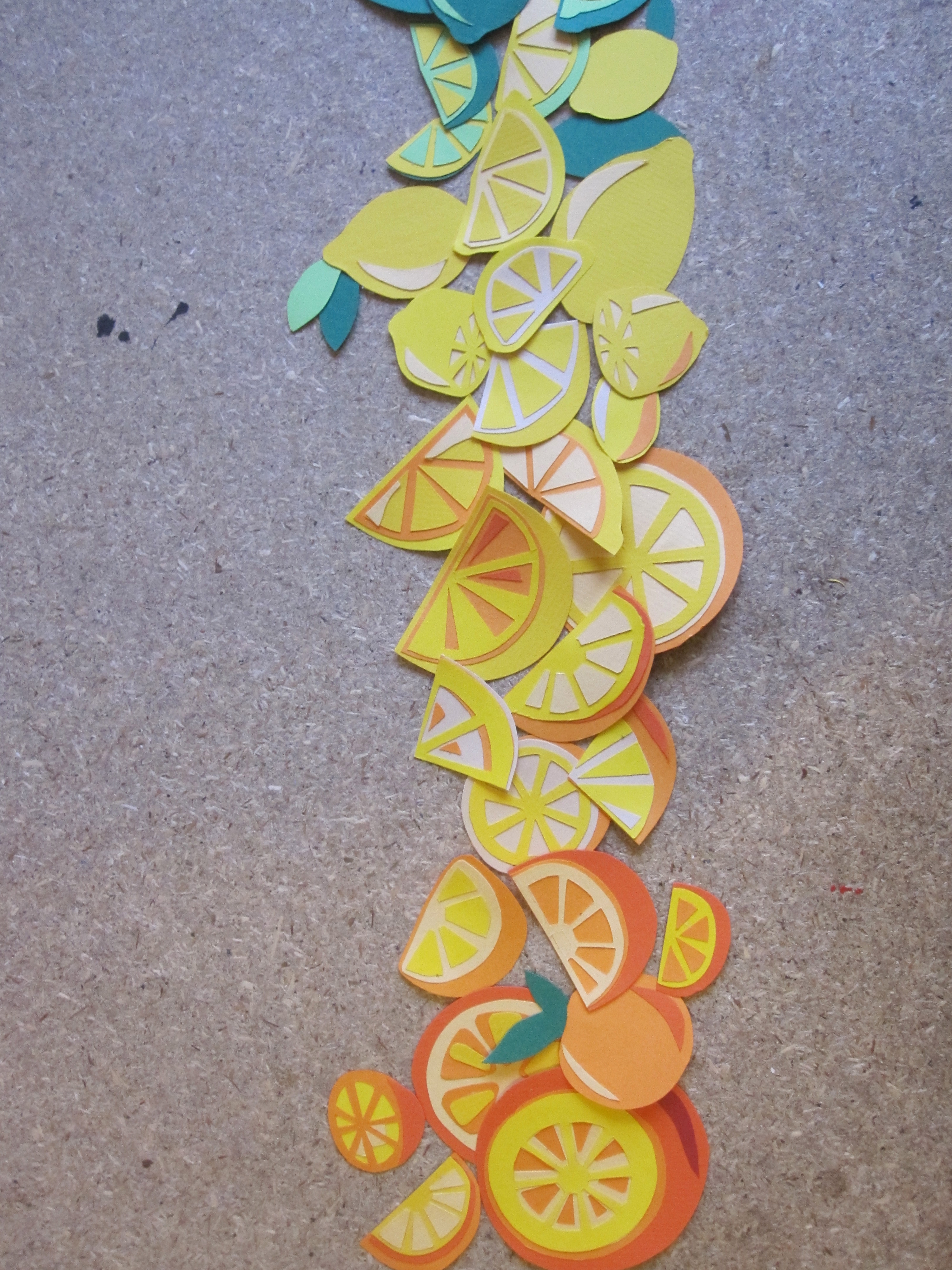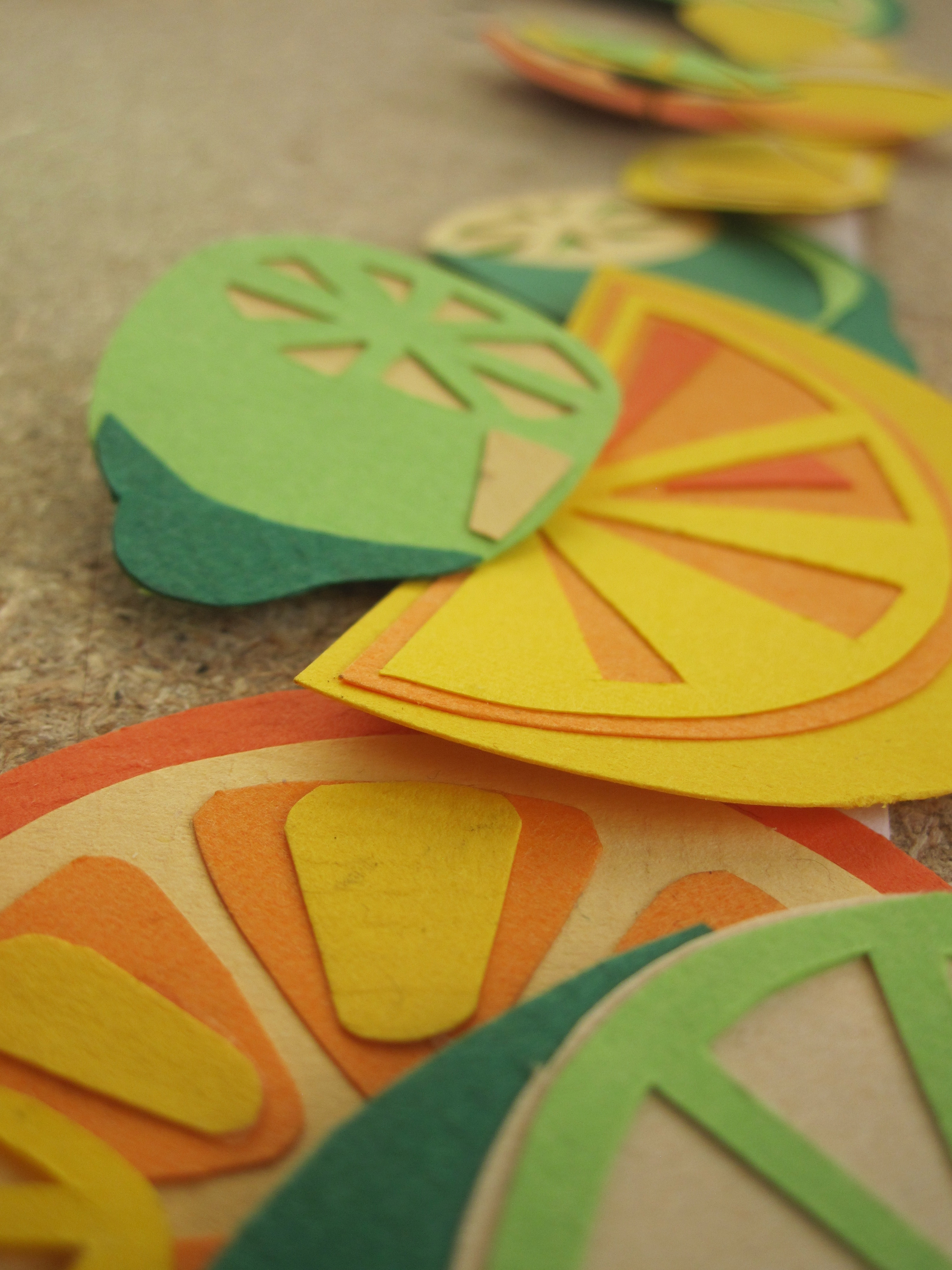 I’ve been going through an odd Scandanavian phase this past week. I finally picked up ‘The Girl With The Dragon Tattoo” to read (although I initially only started reading it because my colour coordinated bookcase needed more yellow and it was a book with a yellow spine…) and I couldn’t put it down. I raced through the trilogy in one weekend, and then got hungry for (and consumed) food from IKEA, listened to Royksopp, Kings of Convienience, and Mando Diao, and started watched The Killing. Now that I’m starting to awake from my Scandi-coma, I started thinking about Scandanavian art and patterns, and paper cutting. It made me think about an idea I’d like to try for work, so I set to making lots of fruit and fruit slices out of layered paper.