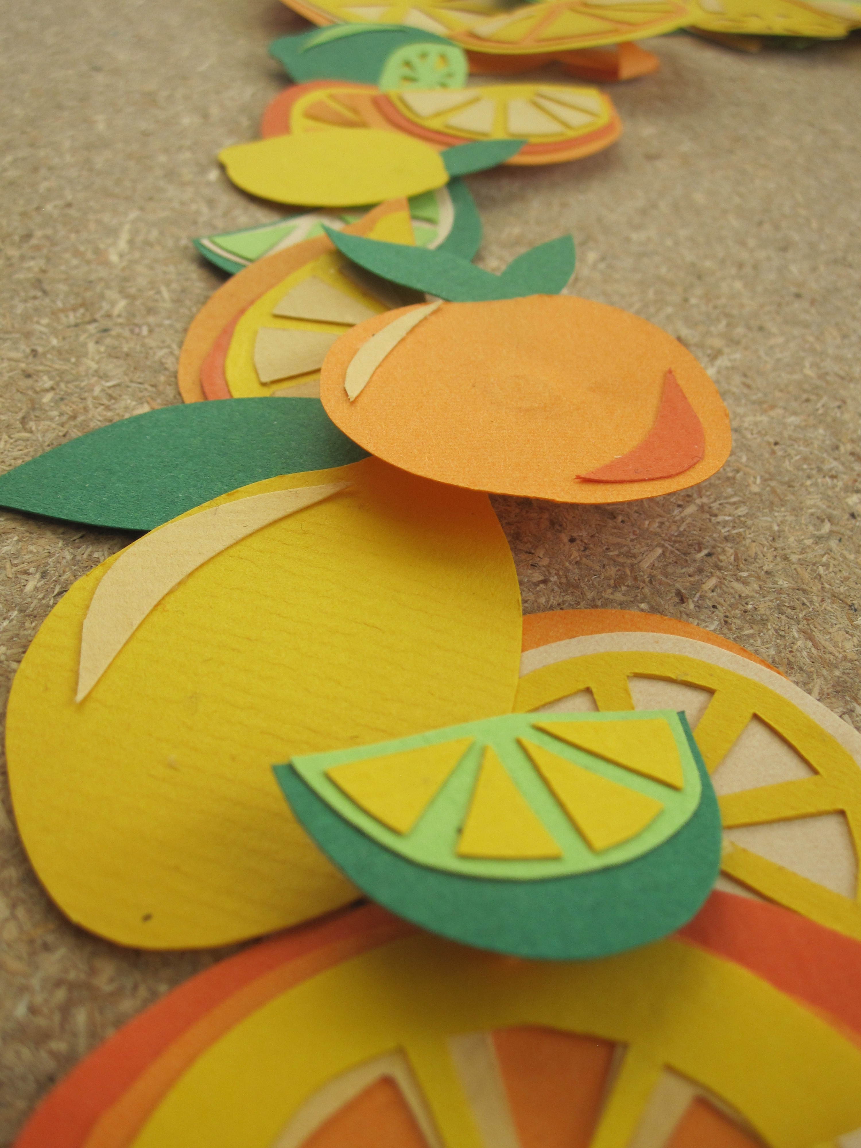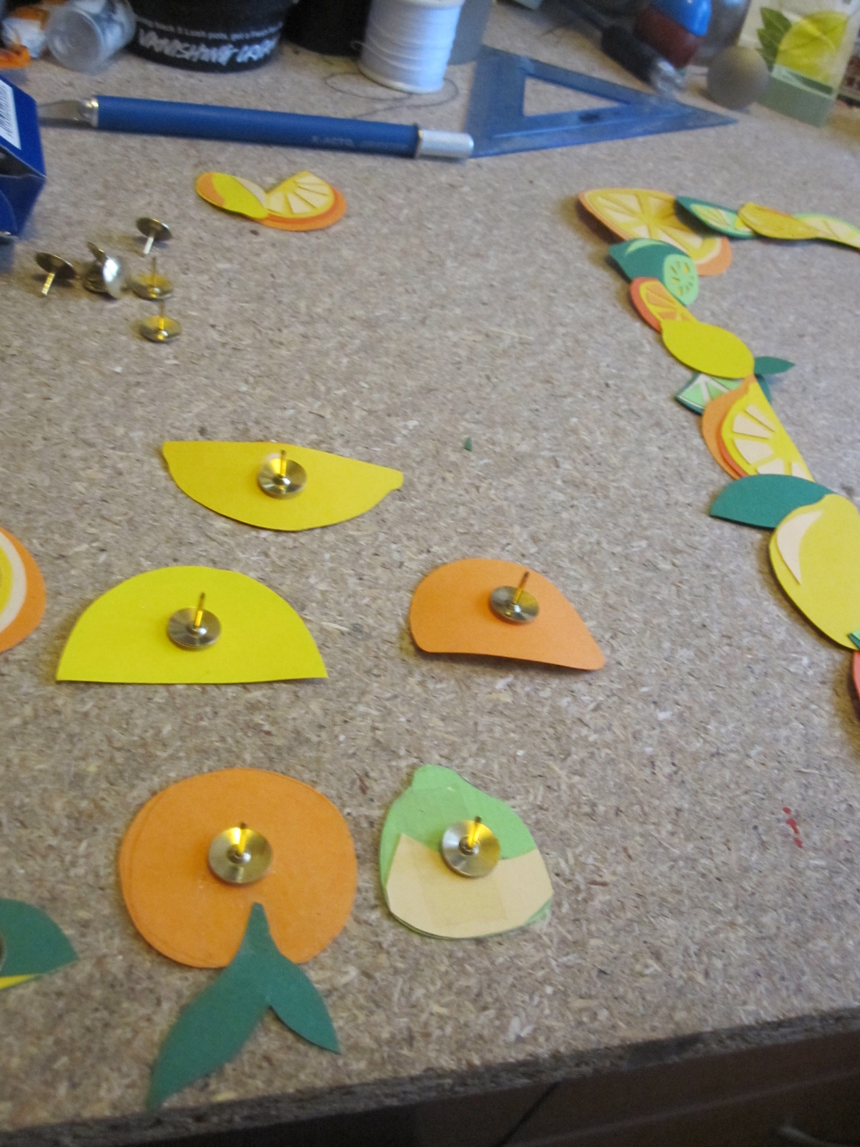 The images came out a bit flat, so I added some tacks and folded paper to the back of some of the fruits to give it a bit more lift: