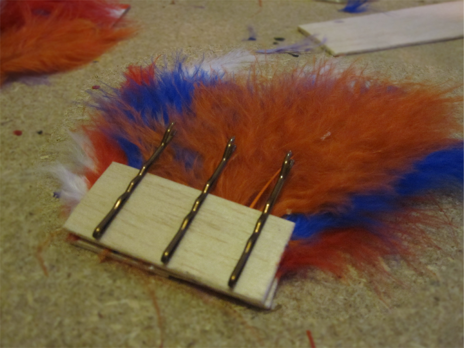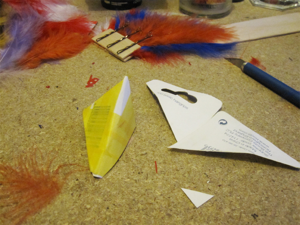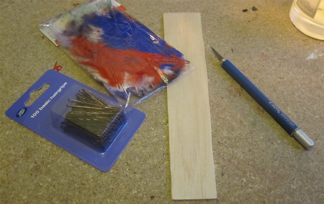 The materials I used are brightly coloured feathers, some thin balsa wood, a craft knife, and some kirby grips/bobby pins.