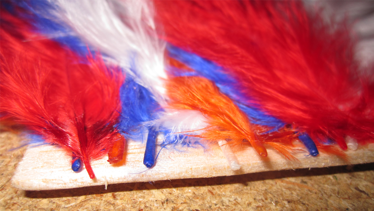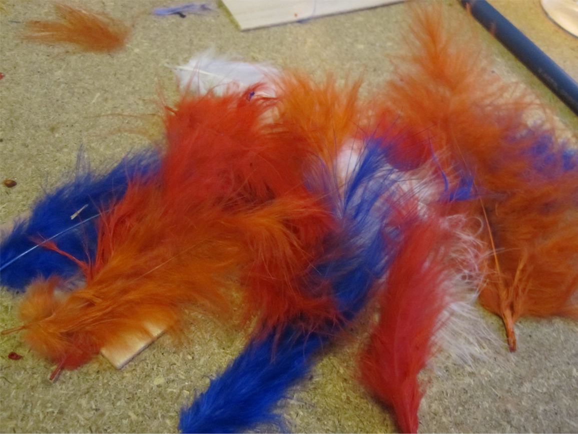 Then, using super glue, I glued the feathers to the balsa wood slider.