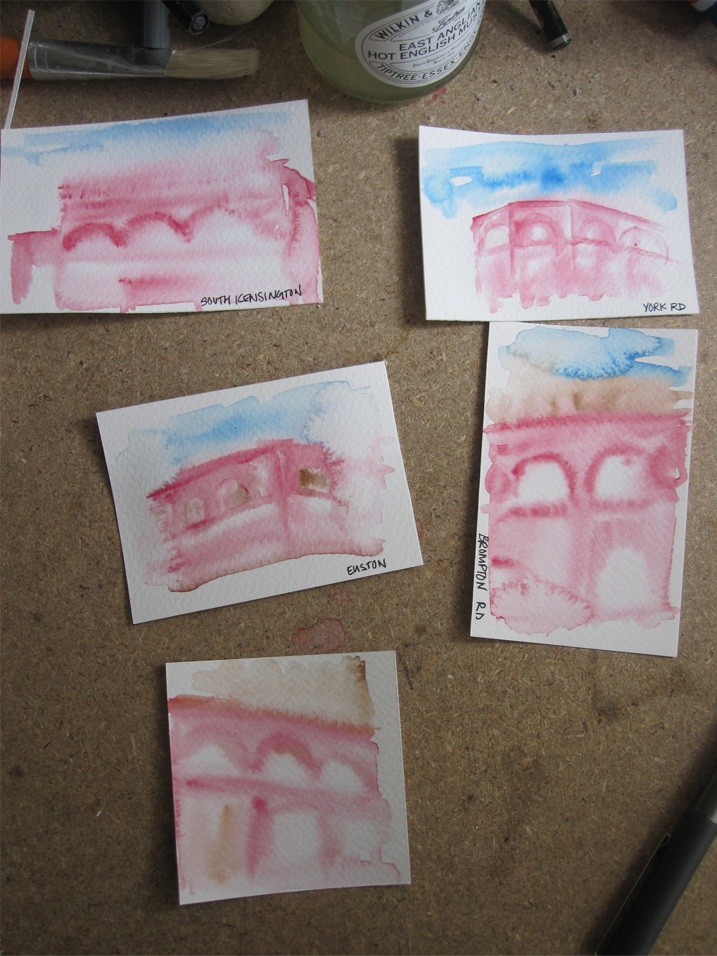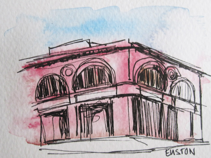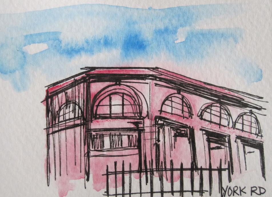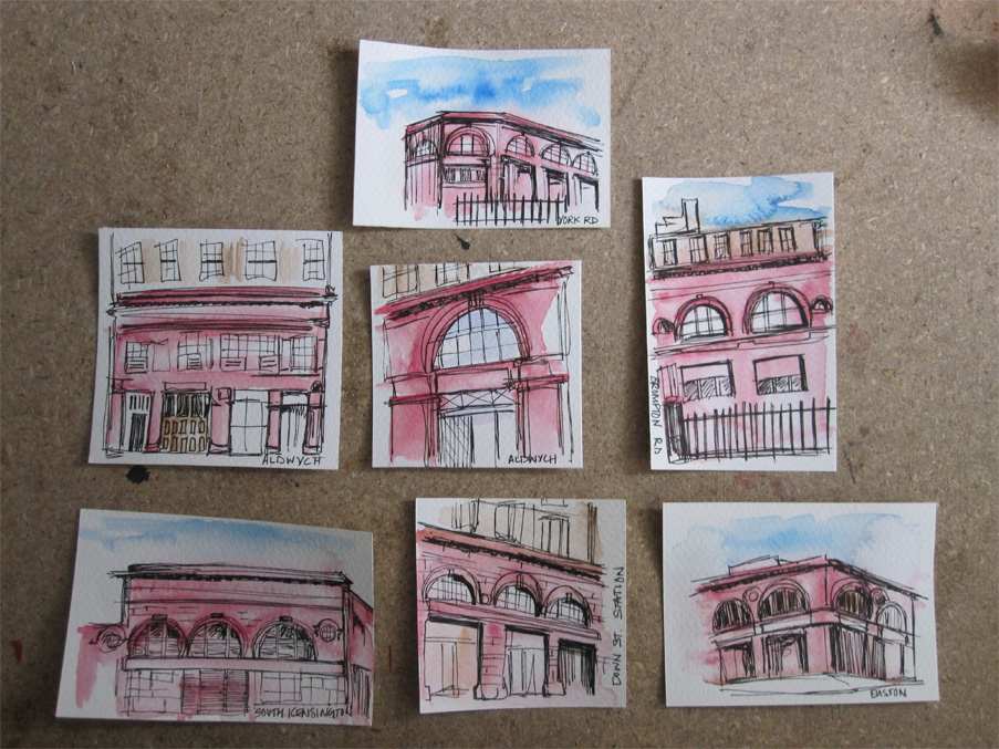 Here are some sketches of station buildings that Green designed that now house ghost, or abandoned stations on London’s underground. They are done by first laying out a loose watercolour background and then drawing over the top with pen and ink.