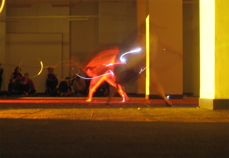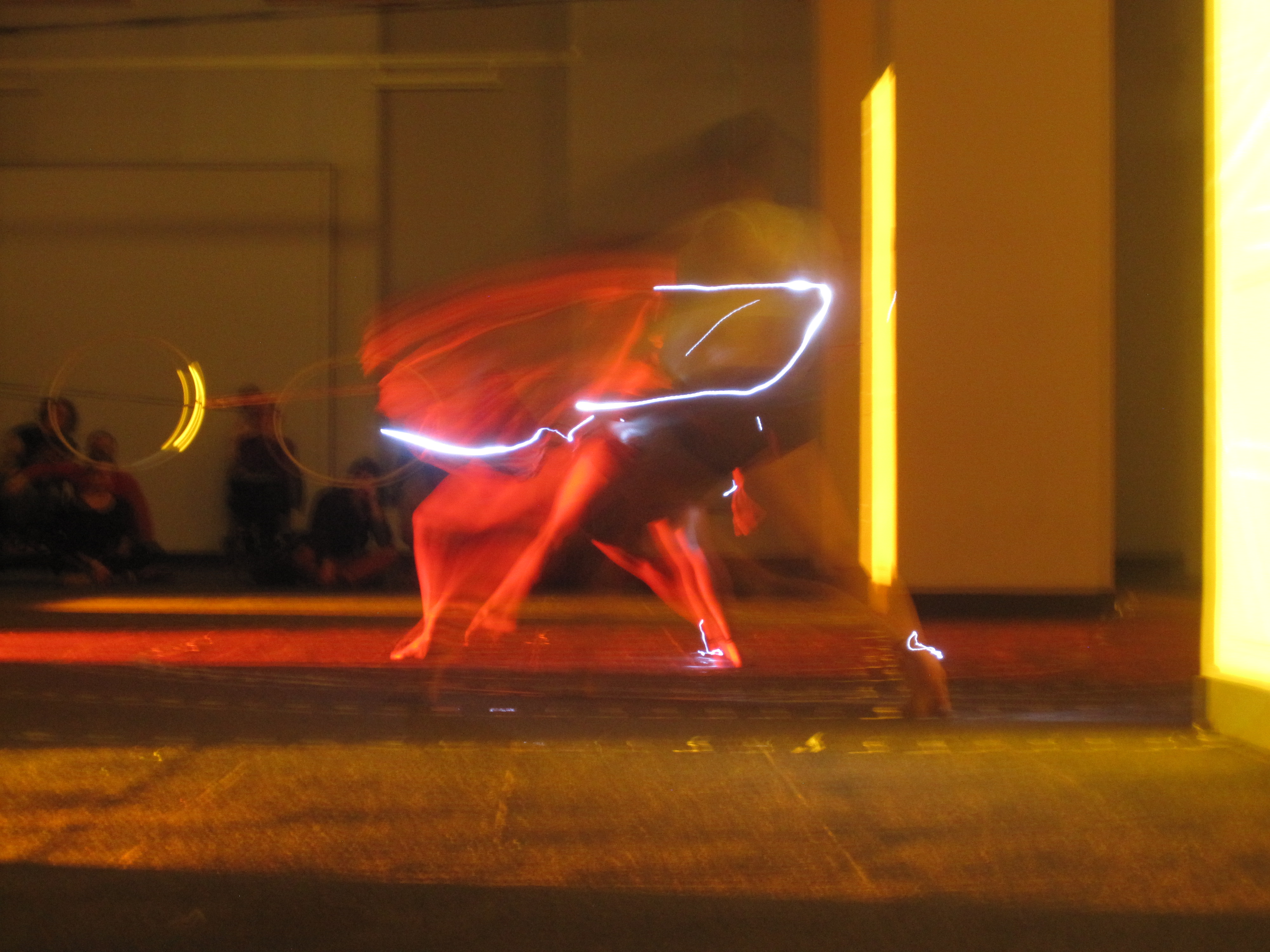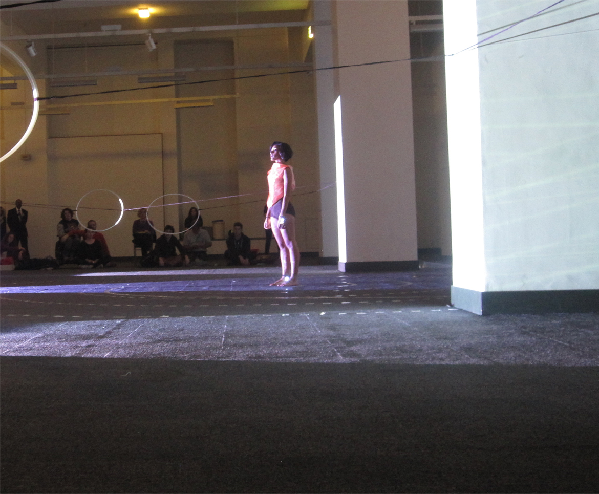 The stage is set in a carpeted and heavily pillared area of the building. Interlocking taped circles adorn the floor, and hoops are held at waist height by taunt ropes stretching the length of the performance area.