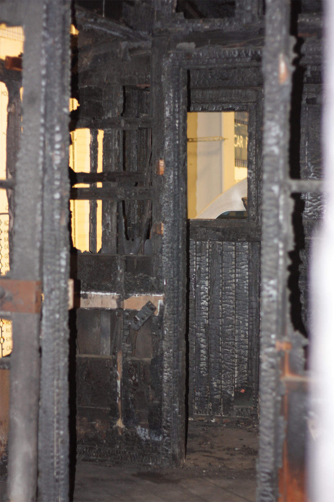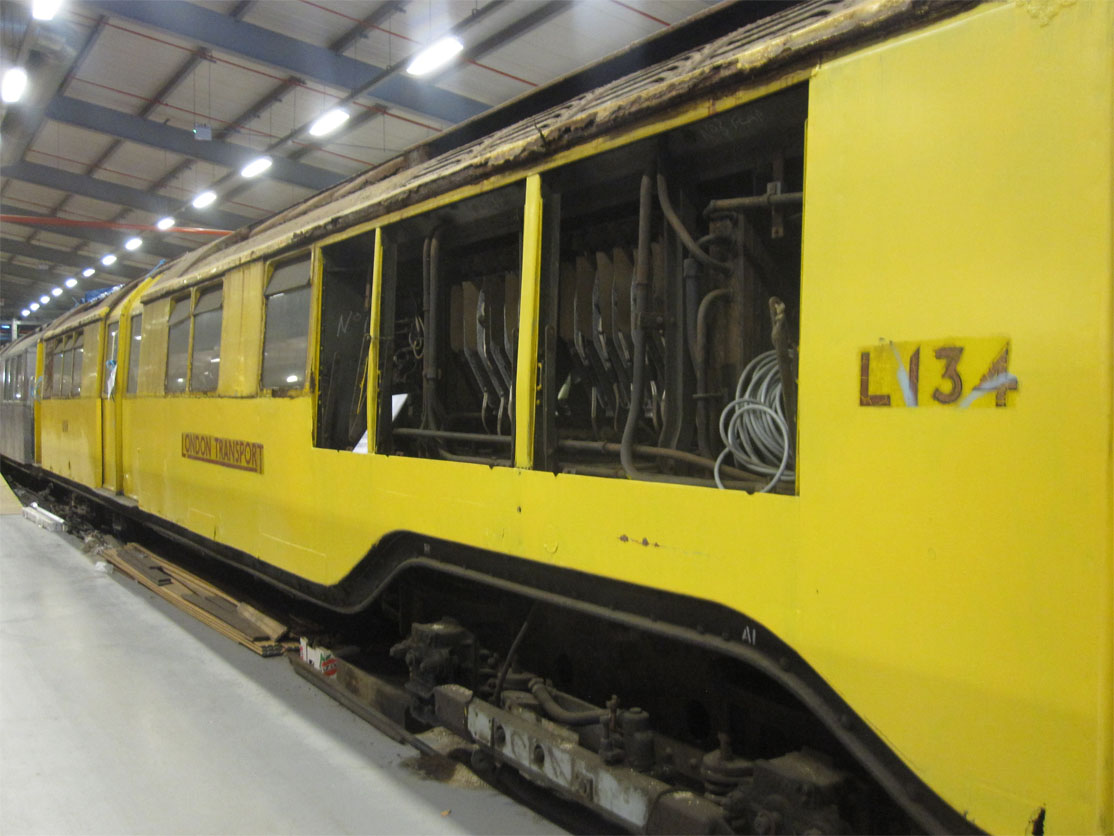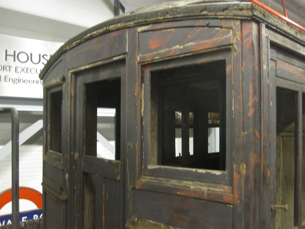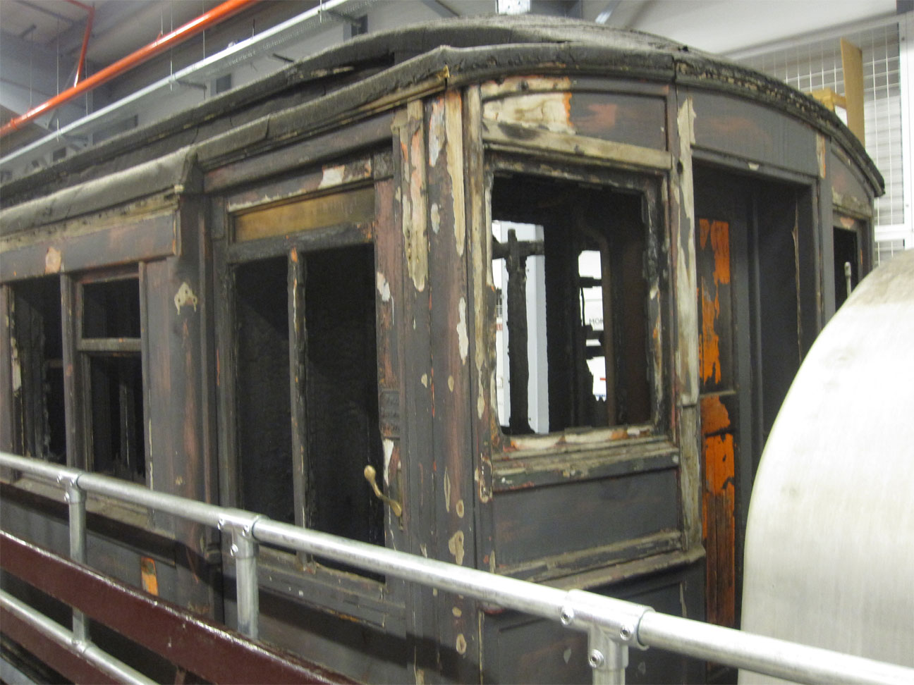 The fire damaged carriage is the only survivor of the Metropolitan Railway’s first electrically-powered trains, heavily influenced by American designs of the time and dating from 1904. There’s a photo here: http://tinyurl.com/nmrlxql