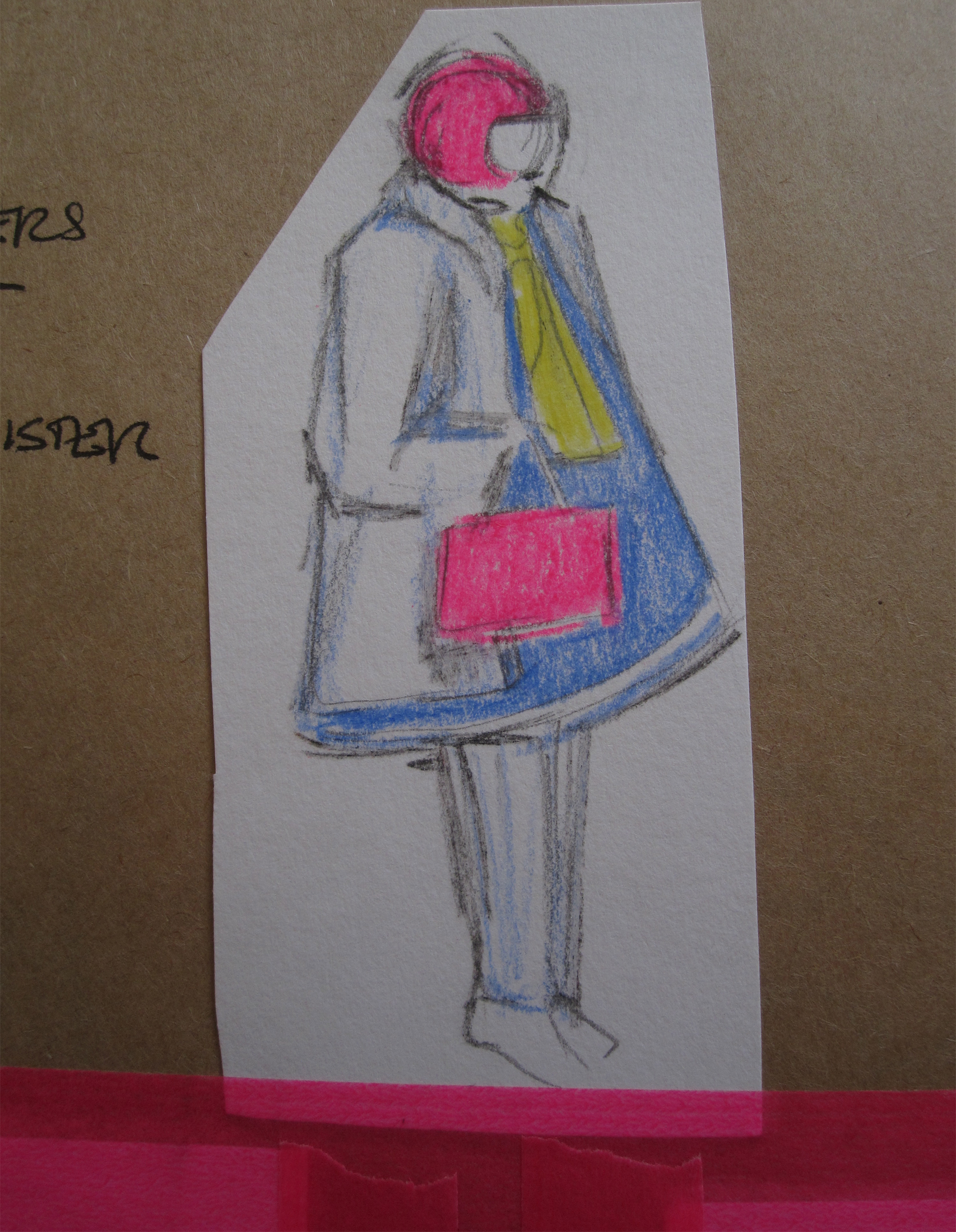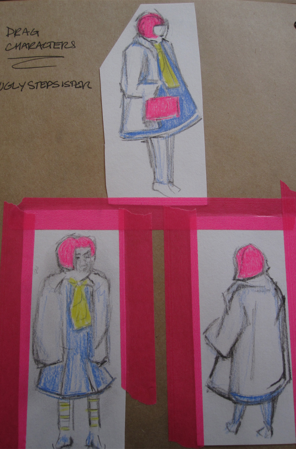 The sketches are a mix of coloured pencil, acrylic paint, watercolour paint on white and brown paper.