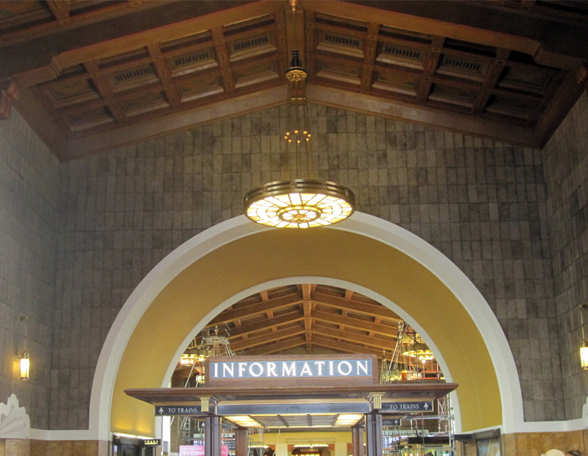 The station was designed by John and Donald B. Parkinson in a mix of Art Deco and Spanish Colonial Revival architecture. The station retains a large number of its original fixtures, and the hall with the original ticket selling counters is absolutely stunning. The station has courtyards and gardens in which to wait in. The tile patterns are suitable vintage, and the marble inlay floor has dips and valleys where years of use has worn away at the stone. Vintage seats still wait for travellers to rest in (these are actually the only seats available!)