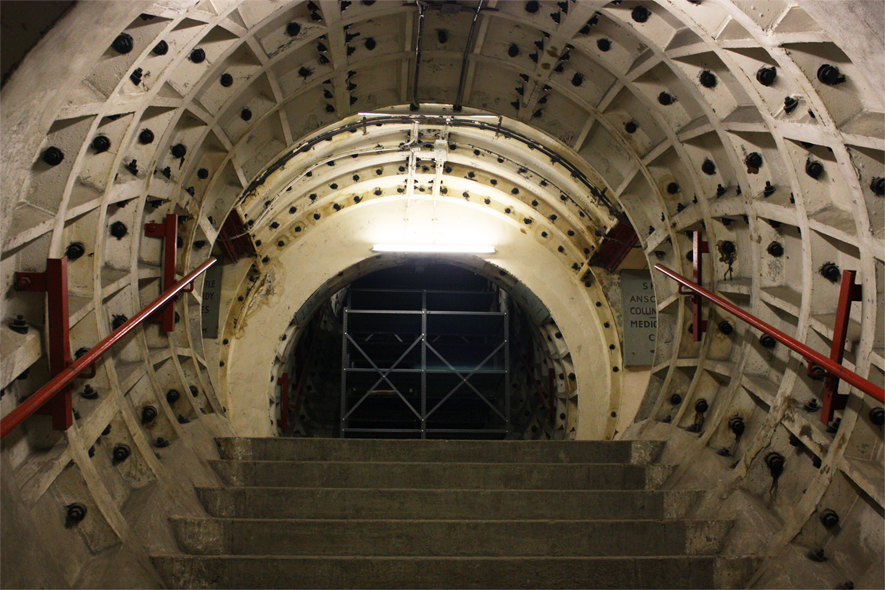 The tunnels are largely formed from leftover pieces of tunnel equipment from the Piccadilly and Northern lines and most of the tunnel reinforcements substantially pre-date WWII. The tunnel rings proudly announce where they’ve come from; this one pictured is quite clearly property of the London Passenger Transport Board (the Transport for London of the 30s and early 40s.)